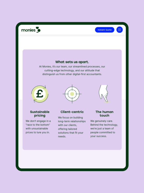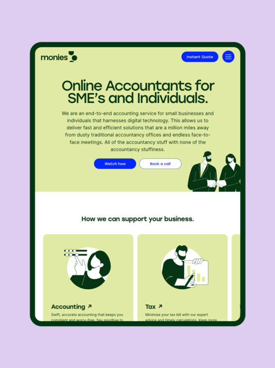 We successfully positioned Monies as an innovative, digital-first accountancy brand, helping it stand apart from traditional firms. Delivered a cohesive identity and conversion-focused website that simplified financial management for time-poor users. Achieved strong search engine visibility to support customer acquisition. Provided a future-proof digital platform and brand foundation, built for long-term growth.